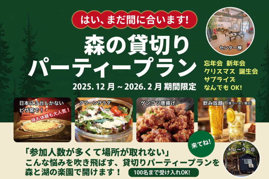 ✨森の貸切パーティープラン✨🎉 冬だけの特別企画! 森の貸切りパーティープラン受付中 ❄️ 忘年会・新年会・クリスマス会・お誕生日・サプライズ… なんでもOK! 最大100名まで貸切可能です✨開催日2025年12月~2026年2月 終了しました焼き芋イベント🍠✨ 秋のやきいもイベント開催! ✨🍠 今年の秋は「森と湖の楽園」で、あったか〜い焼きいもを一緒に楽しみませんか?開催日2025年11月22日(土) /10月23日(日) 終了しましたハロウィンイベント(雨天の為中止となります)悪天候(雨天)のため、安全を考慮し中止とさせていただきました。開催日2025年10月25日(土)~10月26日(日) 終了しました今年最後のSPweek!!ワクワクのイベント盛り沢山!宿泊者の方は参加無料!開催日2025年10月11日(土) /10月12日(日) 終了しましたSPweek #2ワクワクのイベント盛り沢山!宿泊者の方は参加無料!開催日2025年8月9日(土) ~ 8月16日(土)